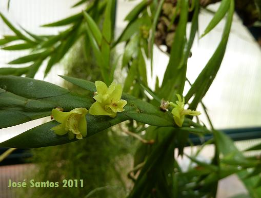 Este Dendrobium, pelo contrário, foi comprado no mesmo passeio que o Epidendrum anterior, mas dá flores todos os anos e várias vezes ao ano. As flores são muito pequeninas mas muito curiosas, de cor verde amarelado. É uma planta epífita endémica da Tailândia. As suas folhas são bonitas, suculentas e achatadas. O meu está montado num pedaço de cortiça onde está agarrado com as suas raízes finas. Agora no Verão rego-o diariamente. Cresce como cabelo despenteado, uma ponta para cada lado, e vai dando keikis que vão enraizando agarrados aos pseudobolbos maiores. É uma planta interessante e uma boa escolha para quem não se importe da ‘pequenês’ das flores.