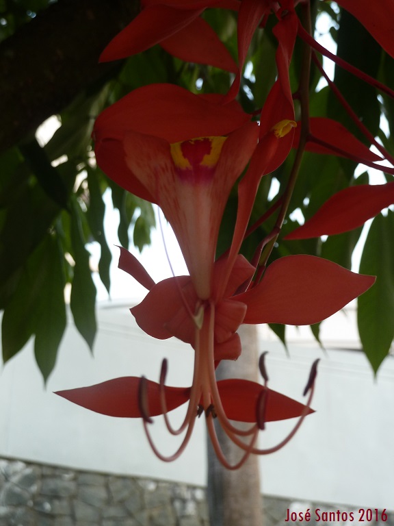Uma bonita árvore à entrada do hotel (foto em baixo) com uma flores vermelhas e muito peculiares (foto acima).