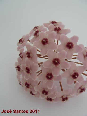 Mais uma Hoya, desta vez um hibrido da H. carnosa. A planta tem as folhas variegadas, cresceu imenso e tem vários cachos de flores como este.