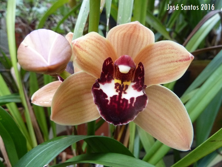 Foto tirada hoje da porta do meu quarto para o terraço. Está tudo muito verde. A folhagem densa dos Cymbidium deixa tudo verde e bonito. Os Cymbidium vão espreitando por entre o verde assim como os Zygopetalum no canto inferior direito da foto. Por baixo do Cymbidium verde e amarelo as pequenas laranjas Kumquat estão a ficar cada vez mais douradas. A meio o Cymbidium Eastern Message ‘Yamatonadeshiko’ acabou de abrir as primeiras flores. Este é o terceiro ano que floresce em minha casa. Os meus Leucojum também já estão em flor no vaso das Strelitzia que já estão a terminar as florações. Ao fundo um Cymbidium acobreado abriu a primeira flor. Tem ao todo três hastes florais.