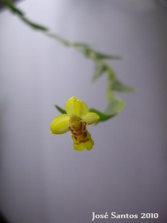 A small micro-orchid non identified that surprised me one of these days with a mini bud. I keep it in a terrarium an water it with a Fogger.
